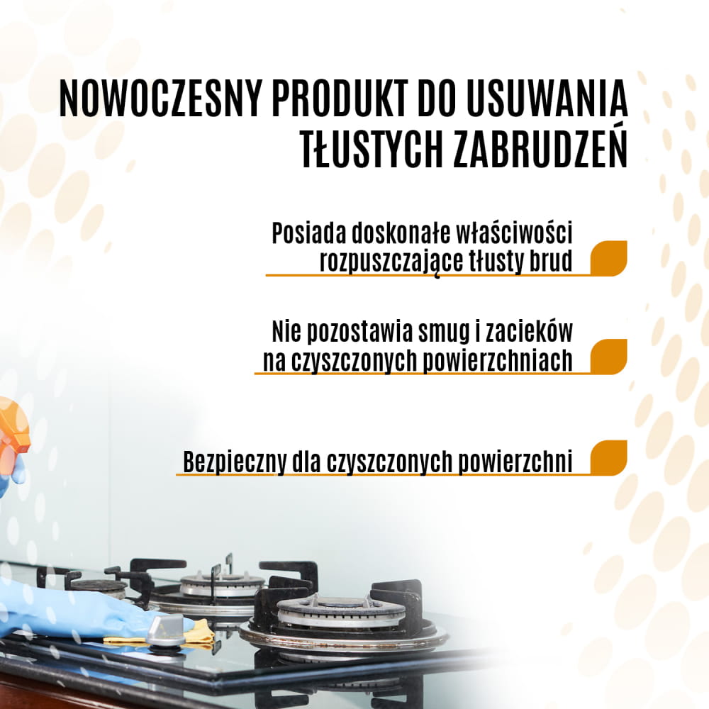 Gotowy do użycia preparat do usuwania wszelkiego typu tłustych i olejowych zabrudzeń. Dzięki zdolności do emulgowania tłuszczu, rozpuszcza silne i uporczywe zabrudzenia olejowo tłuszczowe, przypalone resztki jedzenia, nie pozostawiając przy tym smug i zacieków na czyszczonych powierzchniach. Posiada przyjemny, świeży zapach. Produkt posiada Świadectwo Jakości Zdrowotnej wydane przez PZH.